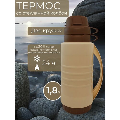 Термос НатаМ для чая 1,8 л со стеклянной колбой и двумя кружками, бежевый