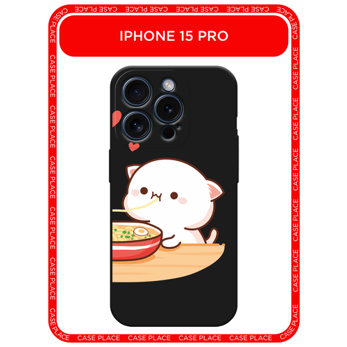 Черный матовый чехол на Apple iPhone 15 Pro / Айфон 15 Про с принтом Белый котик с лапшой