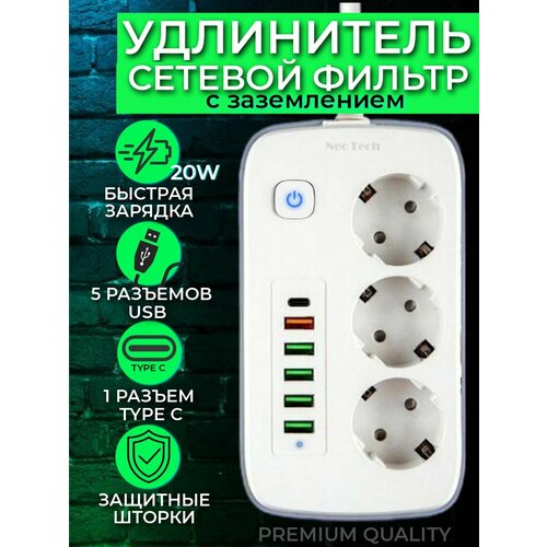 Удлинитель-сетевой фильтр Neo Tech с выключателем и световой индикацией, 5 портов USB 1 порт Type-C