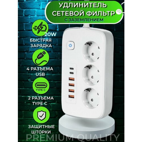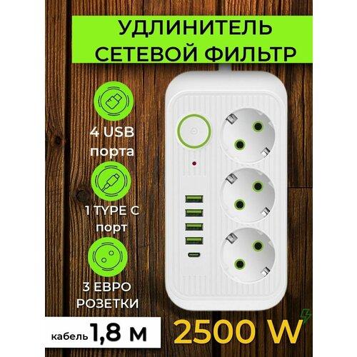 Удлинитель-сетевой фильтр Neo Tech с выключателем и световой индикацией, 4 порта USB 2 порта Type-C