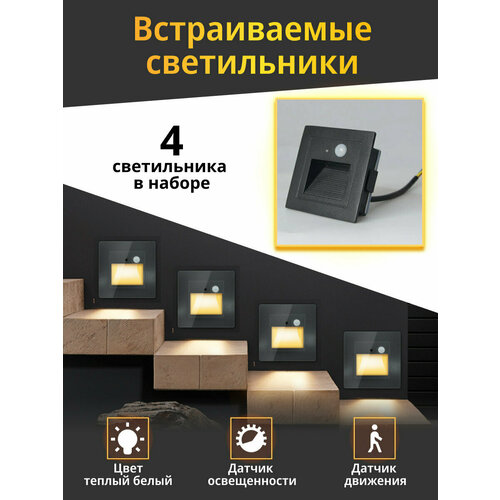 Встраиваемый светильник с датчиком движения 4 шт, подсветка лестницы, черный