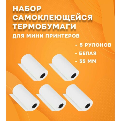 Белая самоклеющейся термобумага для мини-принтера, 5 рулонов шириной 55 мм
