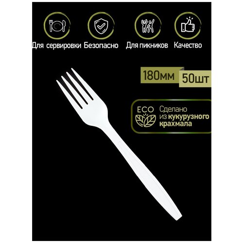 Вилка ЭКО одноразовая из кукурузного крахмала пищевая белая ПакМаркет 180 мм. набор 50 шт. столовые приборы для праздника пикника дачи