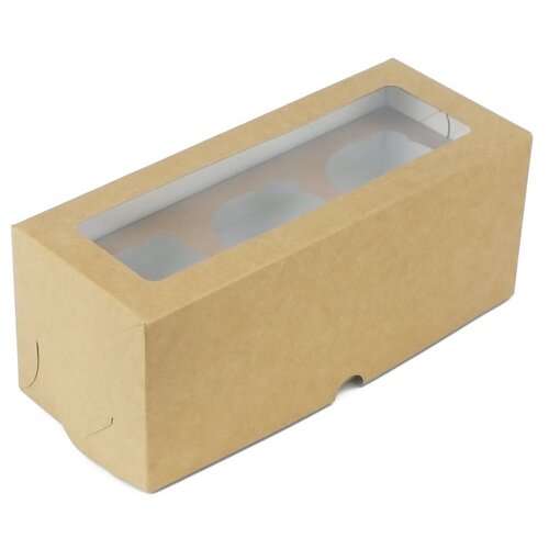 Коробка подарочная Pakman для 3 капкейков с окном, 25 x 10 x 10 см, крафт