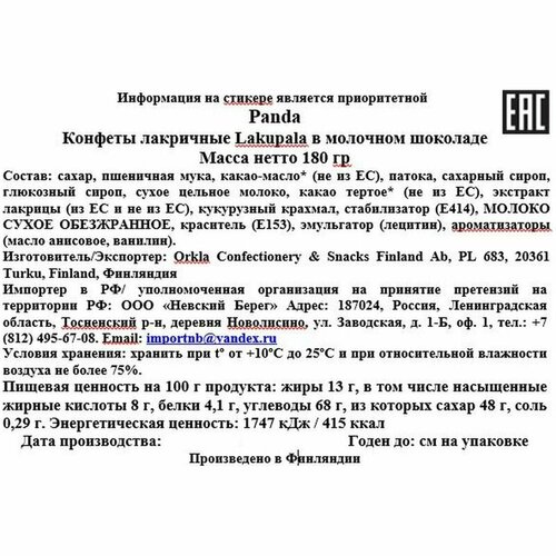 Конфеты лакричные Lakupala в молочном шоколаде 180 г, пакет, т. м. Panda