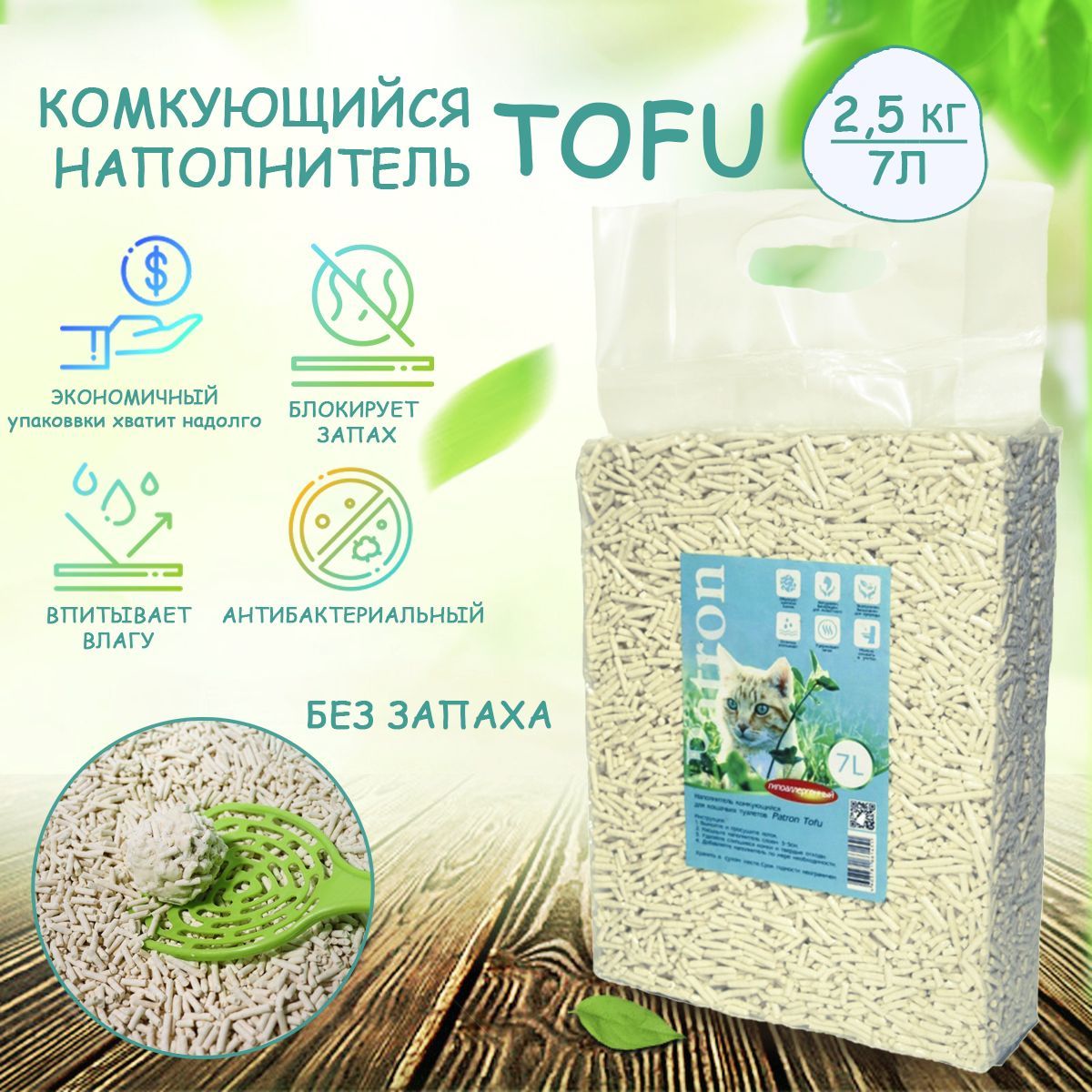 Наполнитель для кошачьего туалета Patron, соевый, TOFU, без запаха, 7 л, 2.5 кг 600013549684