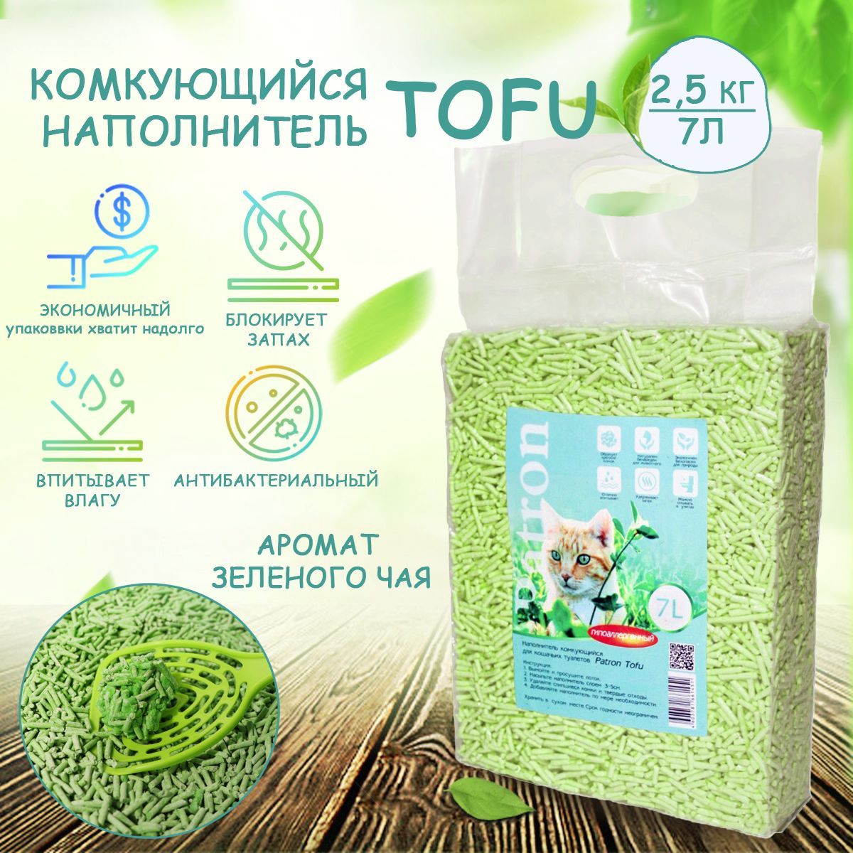 Наполнитель для кошачьего туалета Patron, соевый, TOFU, аромат зеленого чая, 7 л, 2.5 кг 600013549683