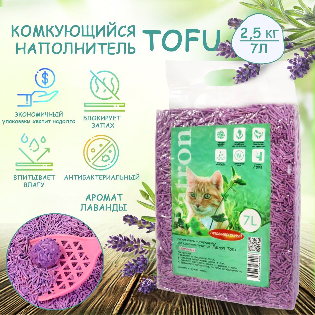Наполнитель для кошачьего туалета Patron комкующийся, соевый, лаванда, 7 л, 2.5 кг 600013549680