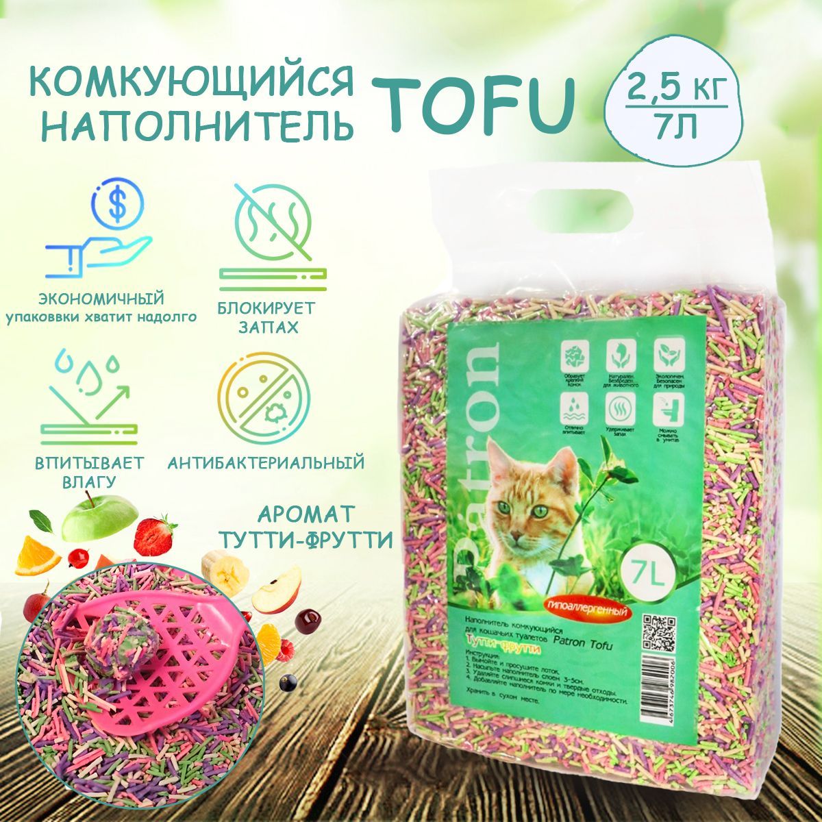 Наполнитель для кошачьего туалета Patron, соевый, TOFU, аромат Тутти-фрутти, 7 л, 2.5 кг Патрон Тофу.
