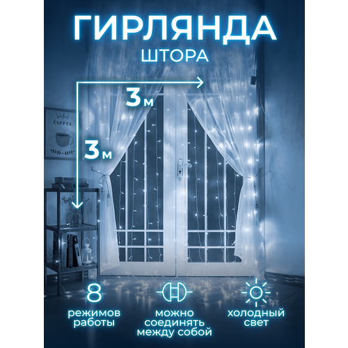 Гирлянда штора 3х3 новогодняя светодиодная занавес на окно, холодная