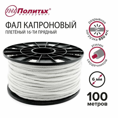 Фал капроновый плетёный 16-ти прядный с сердечником 6 х 100 м Политех Инсрумент
