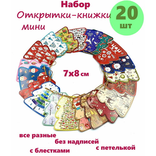 Открытки книжечки /бирки новогодние мини набор 20 шт с блестками "елочки" микс