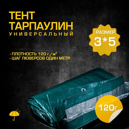 Тент тарпаулин с люверсами плотность 120 гр/м2 (размер 3 м х 5 м) усиленный, туристический для навесов от солнца, для автомобиля, для дачи и сада.
