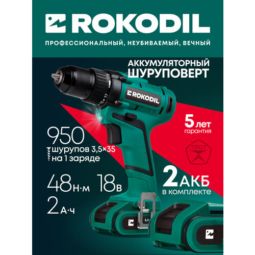 Дрель-шуруповерт аккумуляторная ROKODIL Twist 2 Pro, 18 В, 2 Ач, 48 н/м
