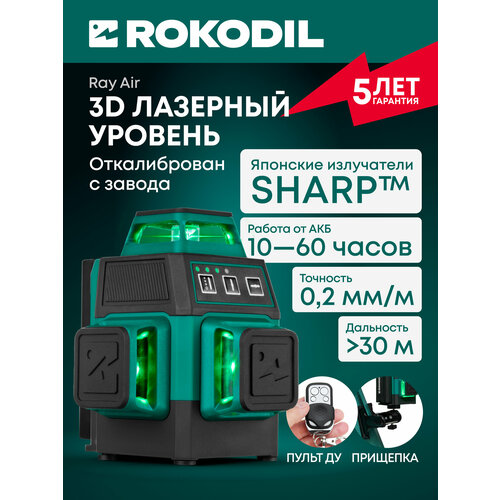 Лазерный уровень 3D Rokodil Ray Air, нивелир лазерный самовыравнивающийся, зеленый луч, 12 линий на 360 градусов, строительный инструмент