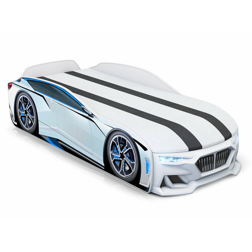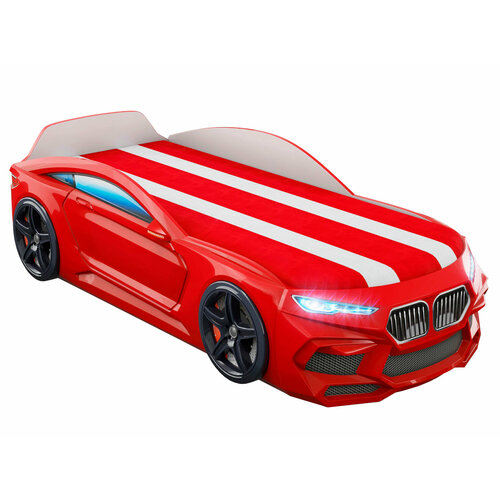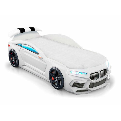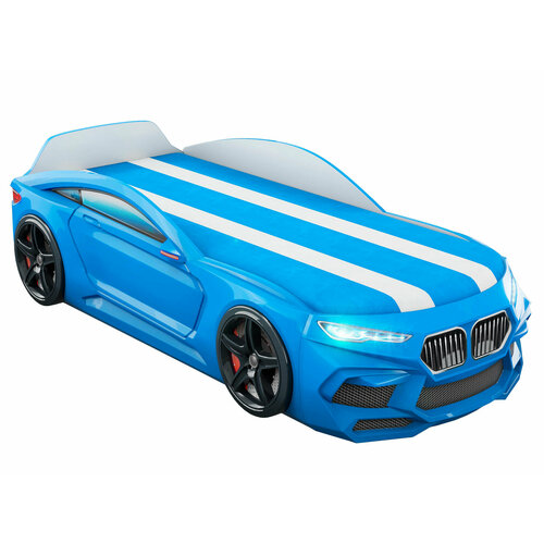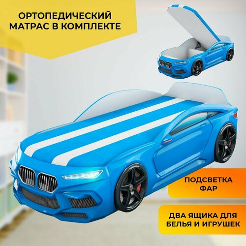 Кровать-машина "Romeo-M" голубая с матрасом, подъемным механизмом, ящиком для белья и подсветкой фар в комплекте