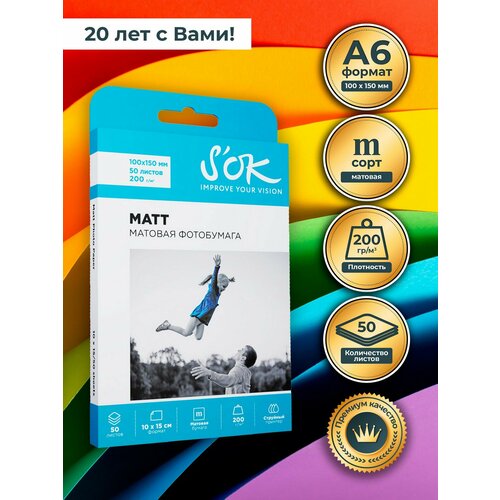 Фотобумага S'OK матовая, формат 10x15, плотность 200г/м2, 50 листов SA6200050M