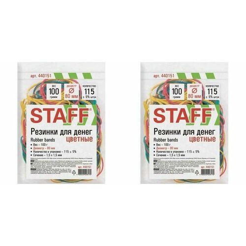 Staff Резинки банковские универсальные, цветные, натуральный каучук, диаметр 80 мм, 100 г, 2 шт