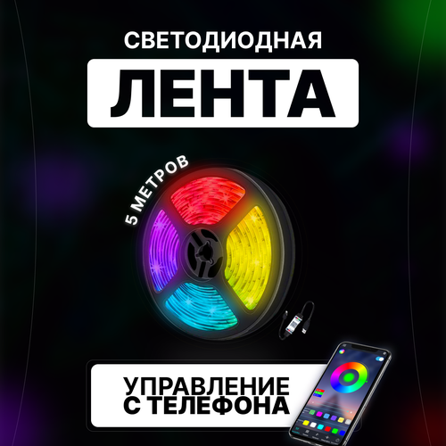 Светодиодная лента, многоцветная, RGB, 5м, Bluetooth, 12в, коннектор для увеличения длины