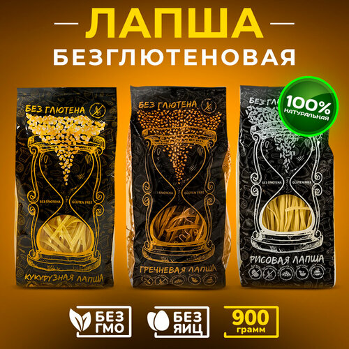 Набор лапши без глютена и яиц Рисовая, Гречневая, Кукурузная 900 г (3 пачки)