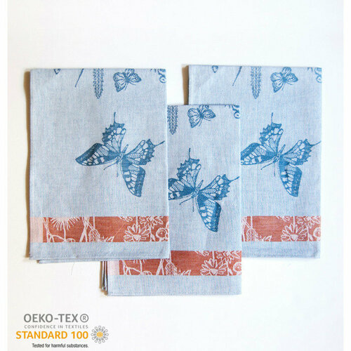 Набор кухонных полотенец премиум, лен + хлопок, жаккард, 3 шт 49 х 70 Сертификат OEKO-TEX ID: 349_Бабочки (49х70 см, Аква)