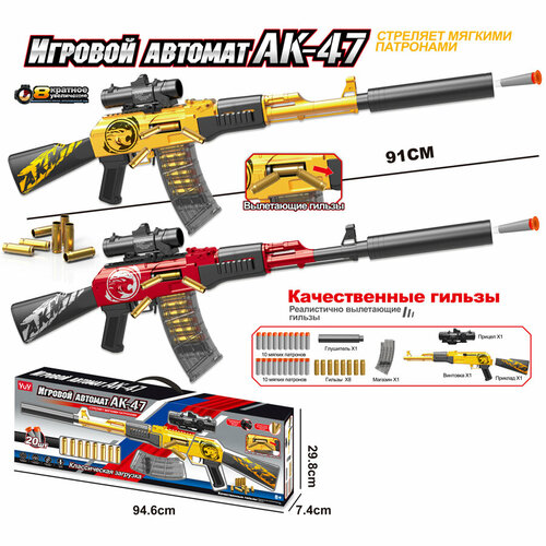 Детский автомат-бластер Калашникова АКМ RED Красный с глушителем, оптическим прицелом и выбросом гильз (92 см), мягкие пульки и присоски