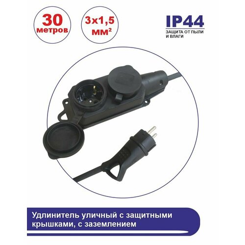 Удлинитель морозостойкий в бухте, 2 розетки 30 метров с защитными крышками, с заземлением, 16 А, КГ (ГОСТ) 3x1.5 мм, черный