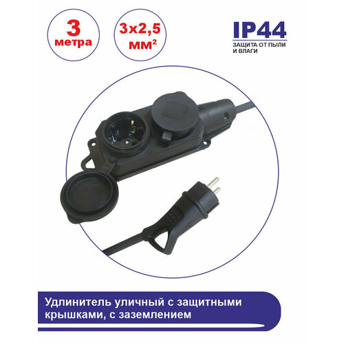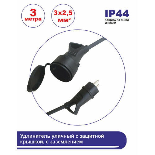 Удлинитель морозостойкий в бухте, 1 розетка 3 метра с защитной крышкой, с заземлением, 16 А, КГ (ГОСТ) 3x1.5 мм, черный