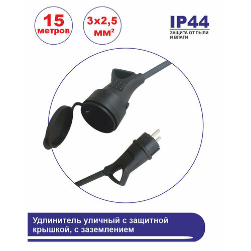 Удлинитель силовой морозостойкий в бухте, 1 розетка 15 метров с защитной крышкой, с заземлением, 16 А, КГ (ГОСТ) 3x2.5 мм, черный