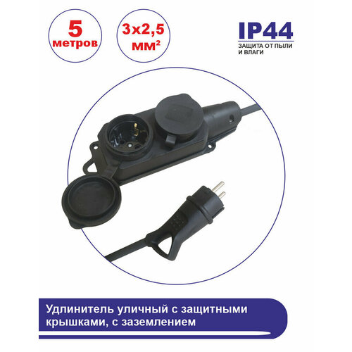 Удлинитель силовой морозостойкий в бухте, 2 розетки 5 метров с защитными крышками, с заземлением, 16 А, КГ (ГОСТ) 3x2.5 мм, черный