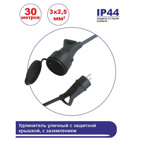 Удлинитель силовой морозостойкий в бухте, 1 розетка 30 метров с защитной крышкой, с заземлением, 16 А, КГ (ГОСТ) 3x2.5 мм, черный