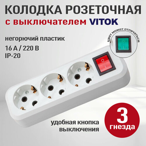 Розетка колодочная электрическая (колодка накладная для удлинителя) 3 гнезда с выключателем и заземлением, VITOK, 16А, 220В