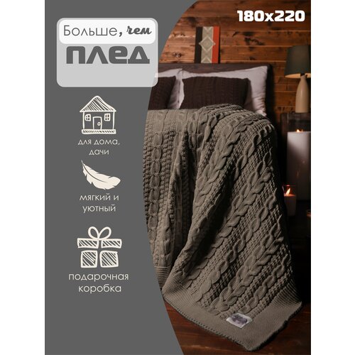 Плед, вязаный, Косы, Warm Whiff, хаки, 180х220, хлопок, покрывало для взрослого, дивана, на кресло, большой, красивый, нежный, натуральный