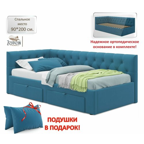 Односпальная кровать-тахта угловая Afelia 900 синяя Zeppelin с ортопедическим основанием , 90х200, мягкая из велюра, с ящиками