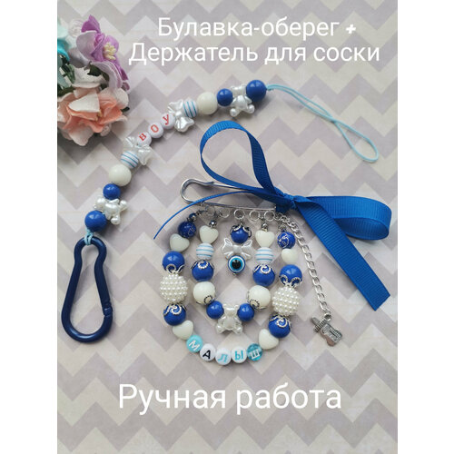 Булавка-оберег и держатель для пустышки "Крошка". Полностью ручной работы! Булавка содержит в себе сразу две функции: защита и украшение. Прикрепите булавку к коляске или кроватке малыша и защитите его от сглаза. Длина булавки 5 см, высота готового изделия вместе с булавкой 8 см. Держатель для соски. Удобно крепится к одежде малыша, тем самым защищая пустышку от падений. С помощью удобного карабина держатель также можно прикрепить к коляске, кармашку, сумке и любому другому предмету. Длина держателя 20-23 см, высота 1-1,5 см. Благодаря своей привлекательности набор из булавки и держателя отлично подходит в качестве подарка для новорожденного, на именины или крещение. Все материалы имеют высокое качество, безопасны для ребенка и надежно закреплены! Важно. Цвета на фото могут незначительно отличаться от реальных.