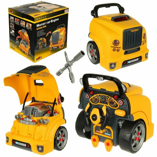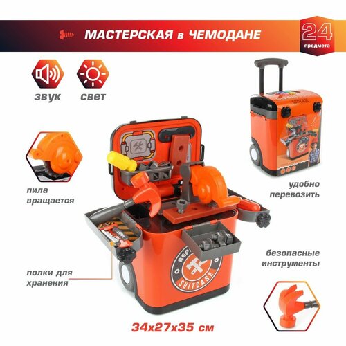 Большое количество предметов, подвижные детали, комфортные для хвата ручки инструментов, шуруповерт с крутящимся патроном, эта детская мастерская понравится каждому ребенку. Детский набор инструментов выполнен в яркой расцветке и стилизованном дизайне. Игровой набор с игрушечными детскими инструментами изготовлен из прочных и безопасных материалов. Благодаря такой игрушке ребенок познакомится с инструментарием в домашней мастерской, узнает назначение предметов и научится ими пользоваться. Игровой набор инструментов детский станет замечательным подарком на Новый год и День рождения. В комплекте каска, резинка к ней, шуруповерт, 5 элементов для сборки столика, топор, молоток, струбцина, комбинированный ключ, угольник, очки, респиратор, рулетка, подставка для инструмента, 3 сменные насадки для шуруповерта, элемент для скрутки, 4 болта, 4 гайки. Шуруповерт трещотка, при нажатии на кнопку издает звук трещотки, патрон прокручивается, насадки меняются. Болты можно вкрутить в элемент для скрутки с помощью шуруповерта