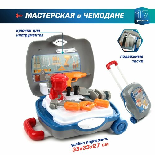 Детский набор игрушечных инструментов для сюжетных и ролевых игр 3 в 1, разложенный верстак, столик и рюкзачок. Детский подарочный набор строителя с большим количеством предметов и подвижными деталями. Мастерская выполнена в реалистичном дизайне, компактно складывается в чемоданчик, можно повесить его на плечи. Детская игрушка изготовлена из прочных и безопасных материалов, имеет крупные элементы. В комплекте детали для сборки верстака, отвертка, игрушечный молоток, накидной ключ, 2 болта, бревно, гайка, элемент для скрутки, 1 строительный элемент, пустая коробочка, картонная декорация, 2 ремня, набор наклеек. Функционал игрушечного верстака. 1. У циркулярной пилы при повороте ручки крутится пильный диск. 2. Шестеренки на рабочей панели вращаются. 3. У поворотного упора с разметкой по секторам и измерительной линейкой передвигается вправо и влево измерительная линейка. 4. Болты вкручиваются в рабочую панель, в гайку, в элемент для скрутки. 5. Болты с помощью отвертки и накидного ключа можно вкрутить и выкрути