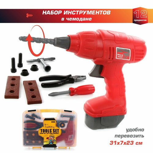 Игровой набор инструментов для мальчиков 12 предметов, Veld Co / Чемодан ящик с инструментами для детей / Шуроповерт, дрель, отвертка