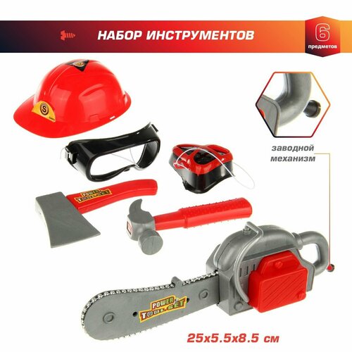 Игровой набор инструментов для мальчиков 6 предметов, Veld Co / Инструменты для детей / Бензопила, молоток, каска