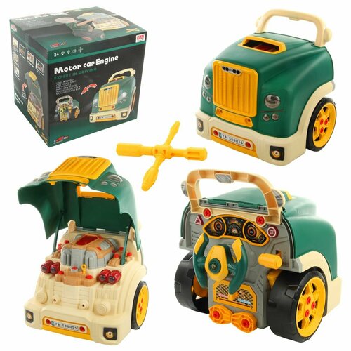 Детский подарочный набор строителя познакомит малыша с инструментами и их назначением. Детский набор игрушечных инструментов оформлен в реалистичном дизайне, обладает яркой и красивой расцветкой, которая понравится каждому ребенку. В комплект игрового набора для сюжетной и ролевой игры входят детали для сборки столика, шуруповерт, каска, ручная пила, угольник, очки, топорик, трубный ключ Стиллсона, пассатижи, молоток, разводной ключ, гаечный ключ, крестовая и шлицевая отвертки, штангенциркуль, элементы для скрутки, тиски, строительные элементы, болты и гайки. Столик легко собирается и разбирается, в нижней части есть подставка с отсеками, можно сложить туда мелкие предметы. На полочках столика есть крючки, можно повесить инструмент, боковые полочки в виде лапок крутятся. В столешнице сделаны отверстия для болтов, строительных элементов и гаек. Можно поставить в отверстия и инструмент, также на столешнице устанавливаются тиски. Ходовой винт у тисков крутится, подвижная губка снимается. Каска на резинке, растяг