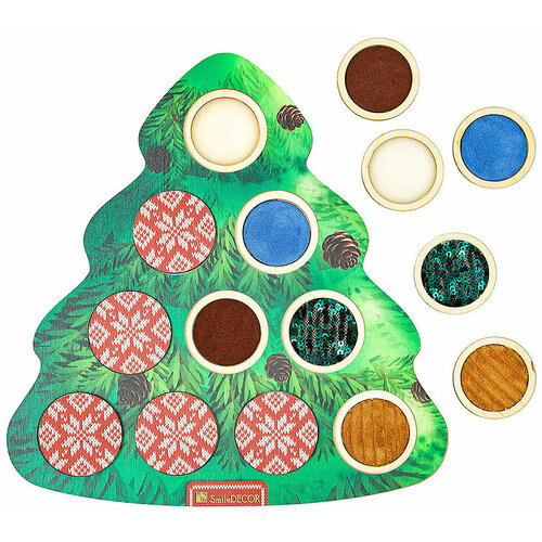 Тактильная сенсорная игра Smile Decor "Ёлочка", деревянная рамка-вкладыш с окошками для сенсорного развития, 10 фишек-фактур