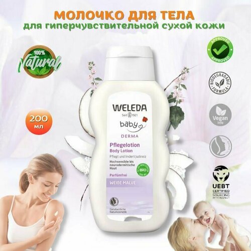 Weleda Молочко для гиперчувствительной кожи тела с алтеем Weibe malve для ежедневного ухода за сухой кожей детей и взрослых, при атопическом дерматите, 200 мл.