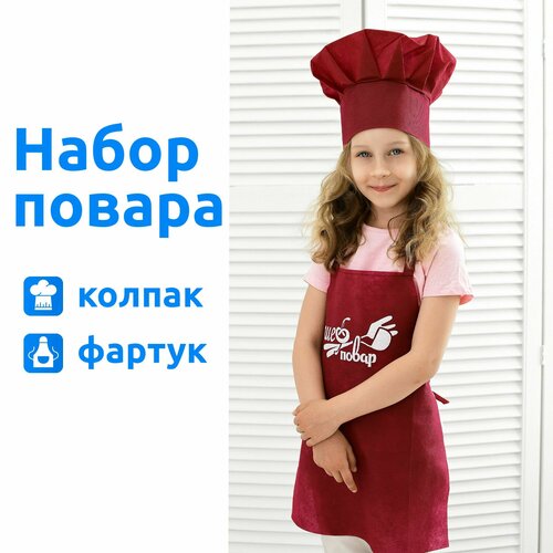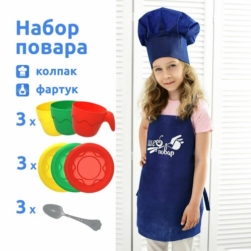 Игровой костюм набор повара детский карнавальный с комплектом игрушечной посуды MEGA TOYS 2 предмета / поварская форма фартук, колпак