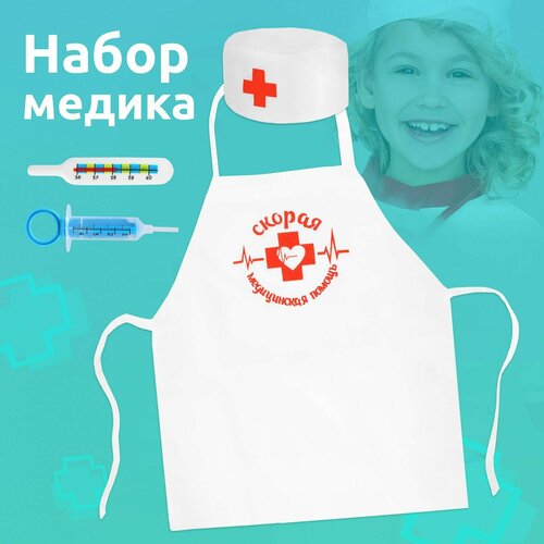Игровой набор доктора детский MEGA TOYS костюм врача для детей / 4 предмета медика (халат-фартук, игрушка шприц, термометр, колпак-шапочка)