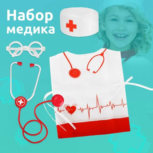 Игровой набор доктора детский MEGA TOYS костюм врача для детей / 4 предмета медика (жилет накидка, колпак, игрушка стетоскоп, очки)