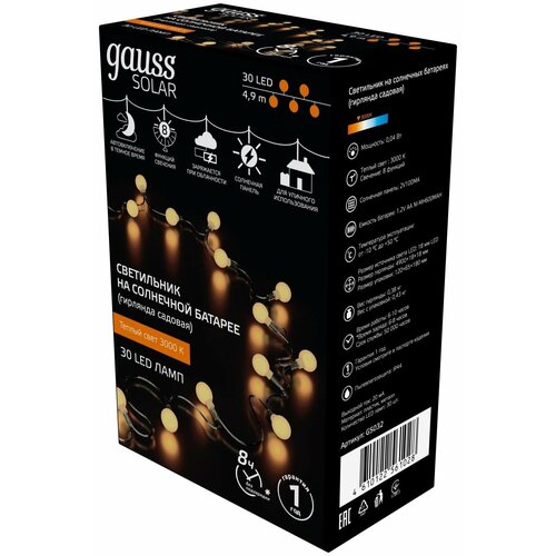 Гирлянда Gauss Solar GS032 нить шарики 30лам. дл.4.9м