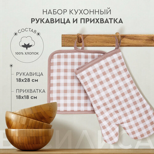 Набор кухонный Василиса Рукавица и прихватка, хлопок 100%, Клетка, Бежевый