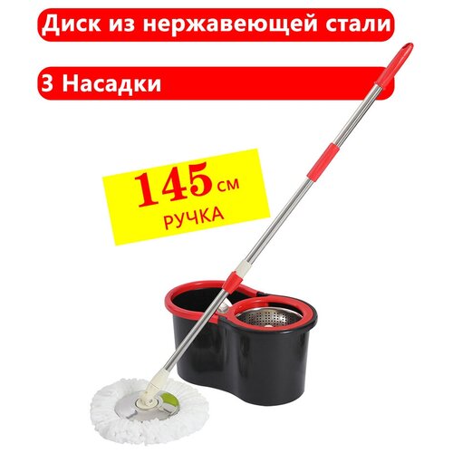 Комплект для уборки AVIK / Швабра с отжимом и ведром (145 см ручка + 3 насадки + дозатор для моющего средства)