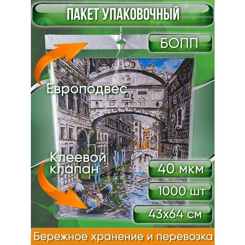 Пакет упаковочный бопп с клеевым клапаном, 43х64+4 см, с европодвесом 4 см, сверхпрочный, 40 мкм, 1000 шт.