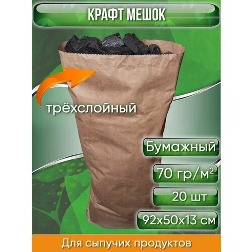 Крафт мешок бумажный трехслойный, размер 92х50х13 см, для сыпучих продуктов, 20 шт.